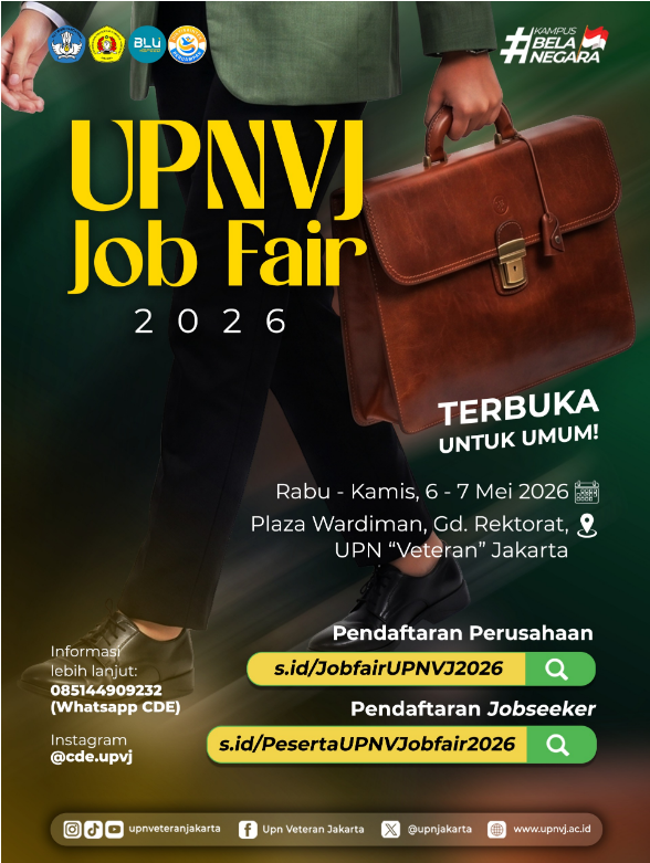 Daftar & Ikuti UPN “Veteran” Jakarta Job Fair 2026 24 April 2026 Reihan FIK 0 View Fullscreen Pendaftaran Peserta UPNVJ Jobfair 2026 dapat dilihat disini Informasi lainnya dapat dilihat pada web UPNVJ Post Views: 21 Share Tags: FIK UPNVJInformasiKampus Bela NegaraUPN "Veteran" JakartaUPNVJ