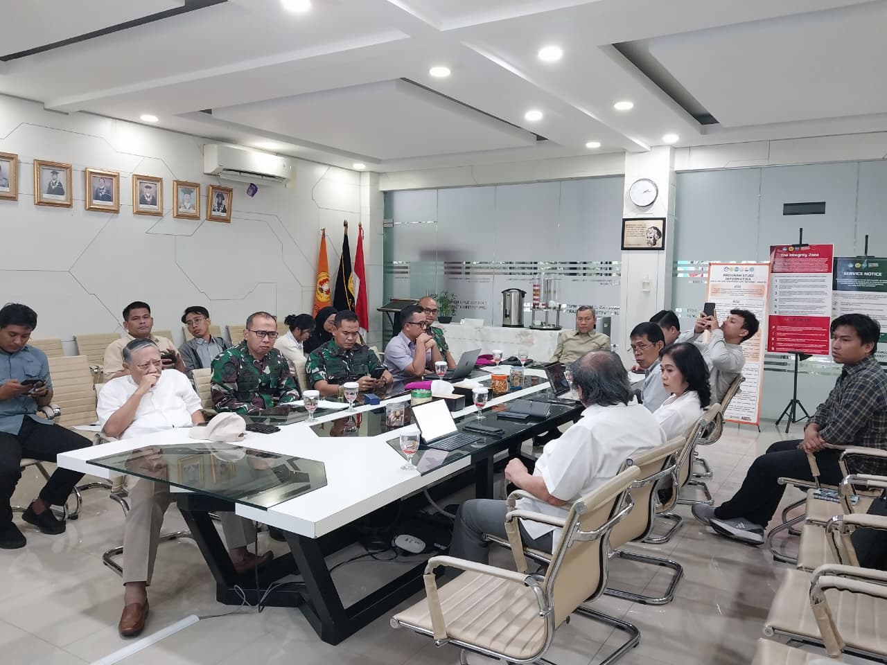 Rapat yang dimulai pukul 13.30 WIB tersebut dipimpin langsung oleh Dekan FIK UPNVJ, Prof. Dr. Ir. Supriyanto, ST., M.Sc., IPM., serta dihadiri oleh jajaran pimpinan fakultas, Advisory Board, dosen, tenaga kependidikan, tim riset, dan KSM Robotik. Pertemuan ini bertujuan untuk menjajaki peluang kerja sama dalam bidang pelatihan, sertifikasi operator drone, serta riset dan pengembangan intelligent unmanned aerial vehicle (UAV) yang terintegrasi dengan kecerdasan buatan, sistem sensor, dan komunikasi data.