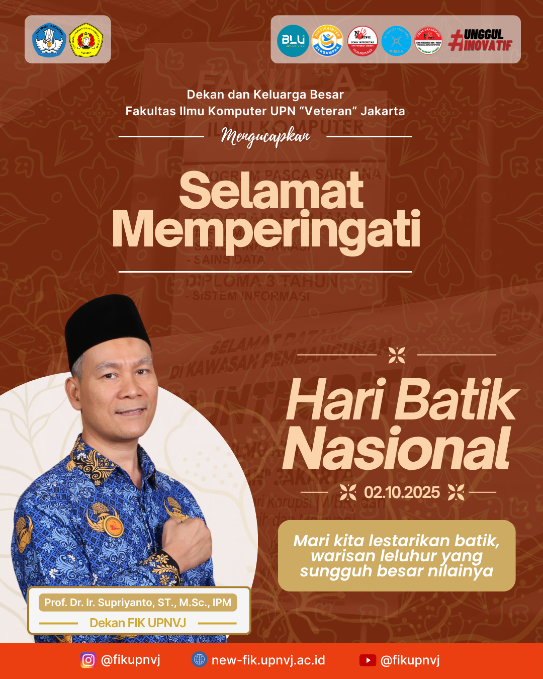FIK UPNVJ – Jajaran Dekanat, Dosen, Tenaga Kependidikan dan Keluarga Besar Fakultas Ilmu Komputer (FIK) Universitas Pembangunan Nasional “Veteran” Jakarta (UPNVJ) mengucapkan Selamat Hari Batik Nasional 2 Oktober 2025. Mari kita lestarikan batik, warisan leluhur yang sungguh besar nilainya.