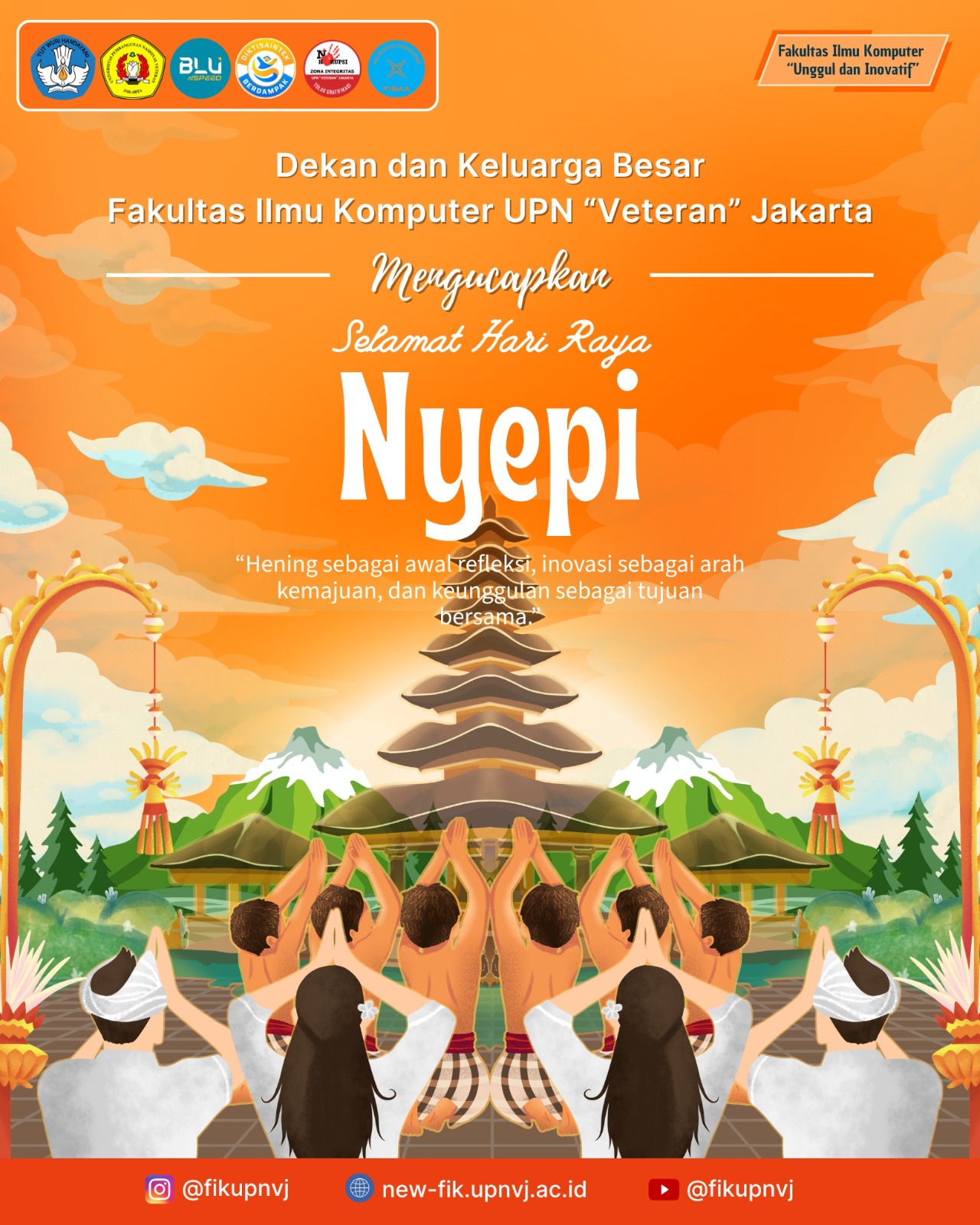 FIK UPNVJ – Seluruh Jajaran Dekanat, Dosen, Tenaga Kependidikan dan Keluarga Besar Fakultas Ilmu Komputer (FIK) Universitas Pembangunan Nasional “Veteran” Jakarta (UPNVJ) mengucapkan Selamat Merayakan Hari Raya Nyepi tahun 2026 bagi seluruh umat yang merayakannya. “Hening sebagai refleksi, inovasi sebagai arah kemajuan, dan keunggulan sebagai tujuan bersama.”