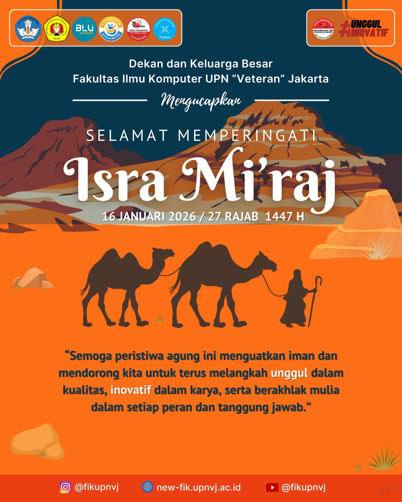 FIK UPNVJ – Seluruh Jajaran Dekanat, Dosen, Tenaga Kependidikan dan Keluarga Besar Fakultas Ilmu Komputer (FIK) Universitas Pembangunan Nasional “Veteran”Jakarta (UPNVJ) mengucapkan Selamat Memperingati Hari Isra Mi’raj Nabi Muhammad Shallallahu ‘Alaihi Wasallam Tahun 1447H/2026. Semoga peristiwa agung ini menguatkan iman dan mendorong kita untuk terus melangkah unggul, dalam kualitas, inovatif dalam karya, serta berakhlak mulia, dalam setiap peran dan tanggung jawab.