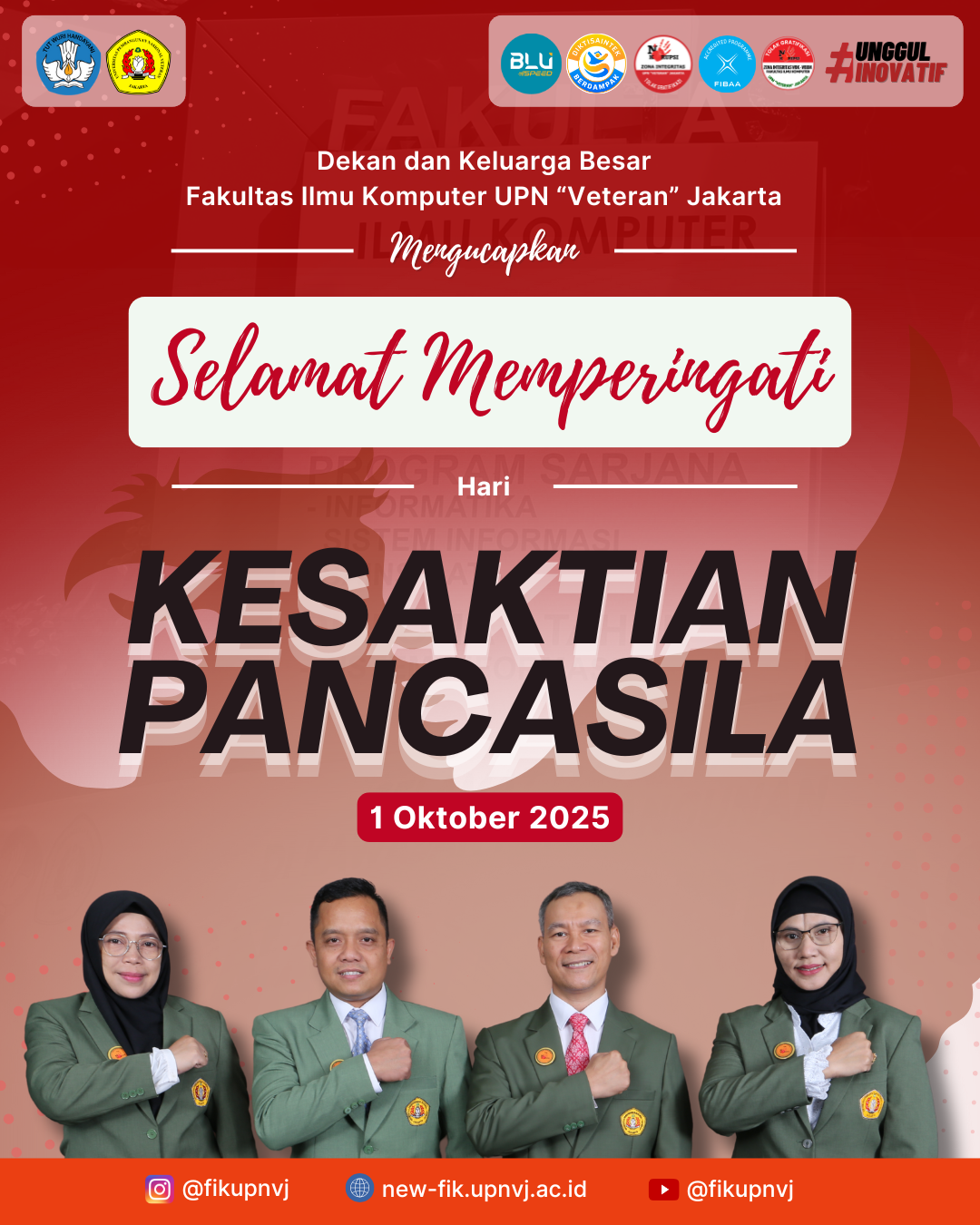 FIK UPNVJ – Jajaran Dekanat, Dosen, Tenaga Kependidikan dan Keluarga Besar Fakultas Ilmu Komputer (FIK) Universitas Pembangunan Nasional “Veteran” Jakarta (UPNVJ) mengucapkan Selamat Memperingati Hari Kesaktian Pancasila 1 Oktober 2025. Mari kita amalkan nilai-nilai Pancasila di setiap segi kehidupan dengan penuh semangat.