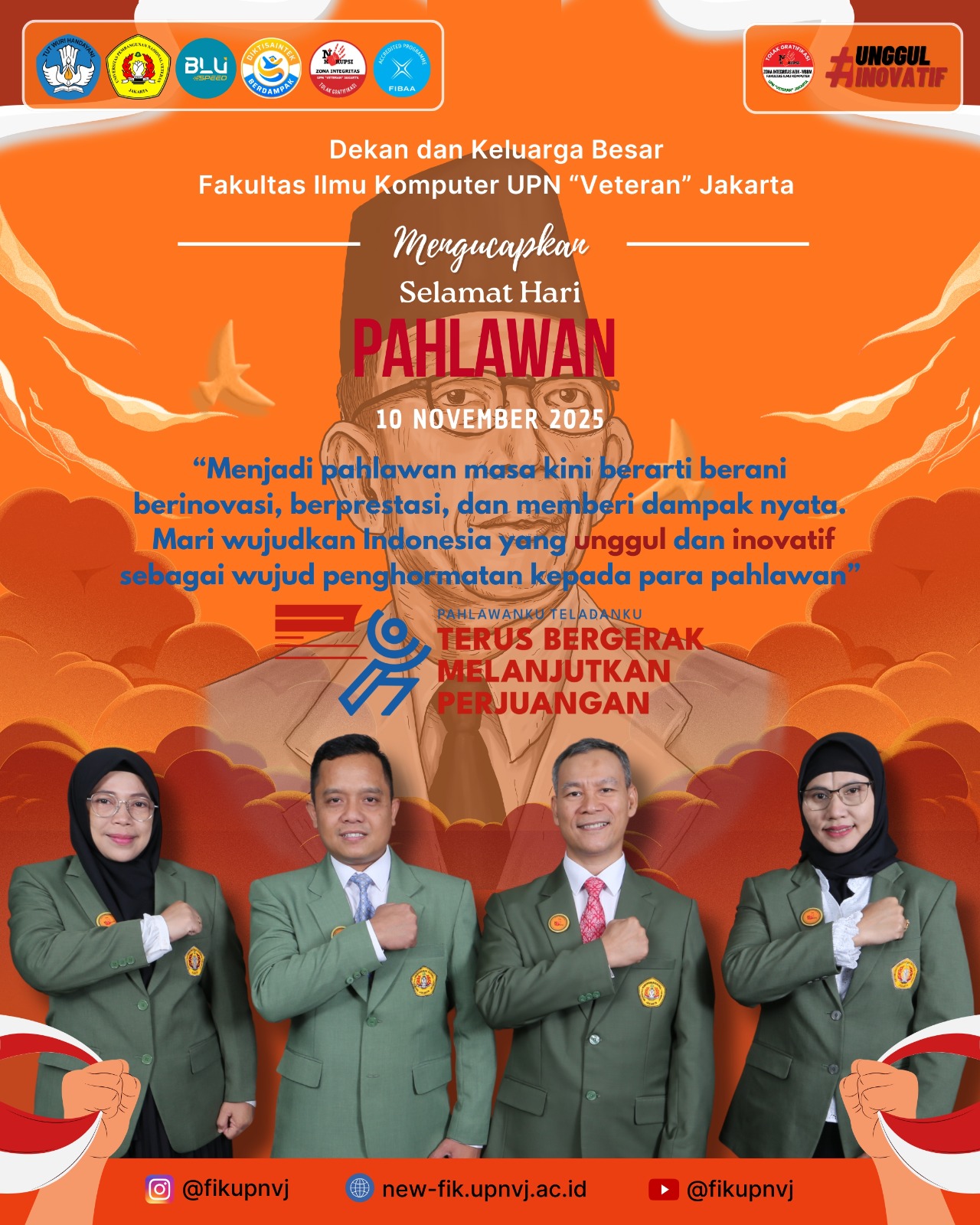 FIK UPNVJ – Seluruh Jajaran Dekanat, Dosen, Tenaga Kependidikan dan Keluarga Besar Fakultas Ilmu Komputer (FIK) Universitas Pembangunan Nasional “Veteran” Jakarta (UPNVJ) mengucapkan Selamat Memperingati Hari Pahlawan tahun 2025. “Menjadi pahlawan masa kini berarti berani berinovasi, berprestasi, dan memberi dampak nyata. Mari wujudkan Indonesia yang unggul dan inovatif sebagai wujud penghormatan kepada para pahlawan”.