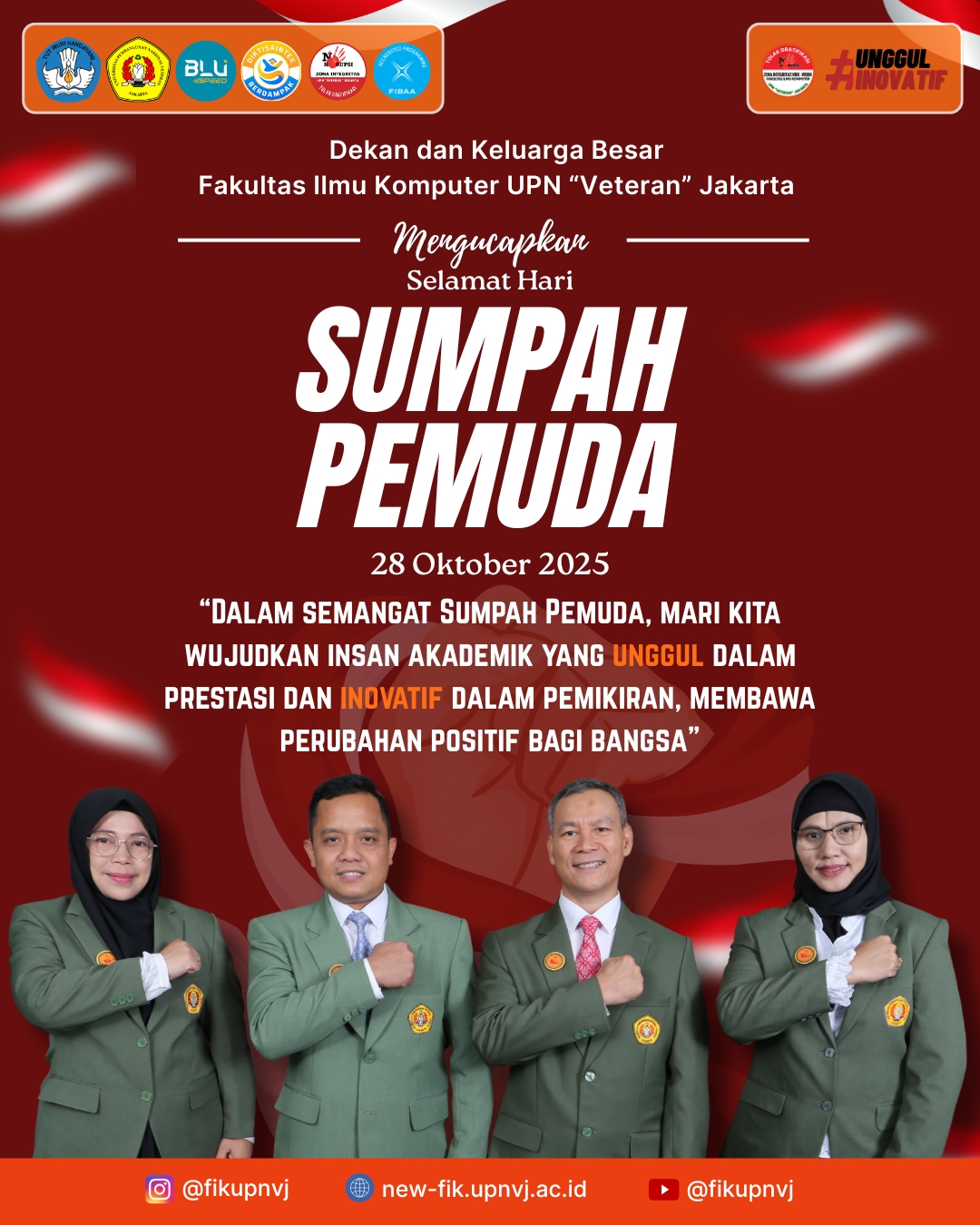 FIK UPNVJ – Seluruh Jajaran Dekanat, Dosen, Tenaga Kependidikan dan Keluarga Besar Fakultas Ilmu Komputer (FIK) Universitas Pembangunan Nasional “Veteran” Jakarta (UPNVJ) mengucapkan Selamat Memperingati Hari Sumpah Pemuda tahun 2025. “Dalam semangat sumpah pemuda, mari kita wujudkan insan akademik yang unggul dalam prestasi dan inovatif dalam pemikiran, membawa perubahan positif bagi bangsa”.