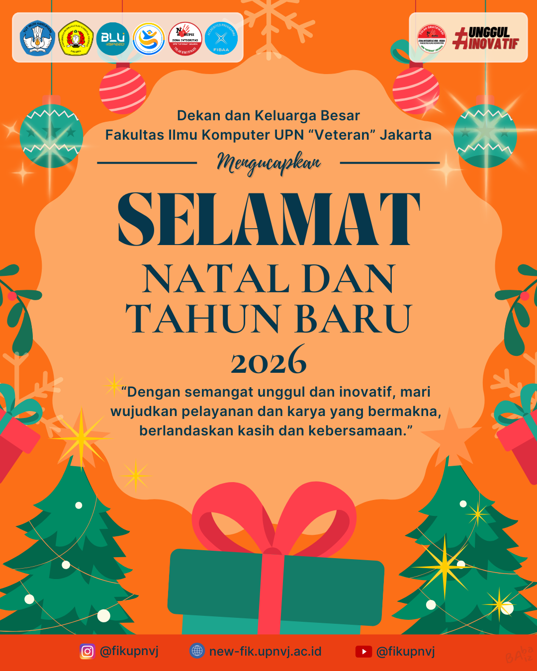 FIK UPNVJ – Seluruh Jajaran Dekanat, Dosen, Tenaga Kependidikan dan Keluarga Besar Fakultas Ilmu Komputer (FIK) Universitas Pembangunan Nasional “Veteran” Jakarta (UPNVJ) mengucapkan Selamat Merayakan Hari Natal dan Tahun Baru 2026 bagi semua yang merayakannya. “Dengan semangat Unggul dan Inovatif, mari wujudkan pelayanan dan karya bermakna, berlandaskan kasih dan kebersamaan”.