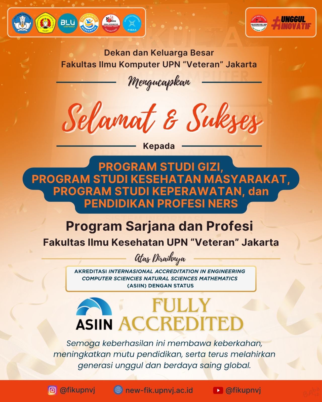 FIK UPNVJ- Fakultas Ilmu Komputer (FIK) Universitas Pembangunan Nasional “Veteran” Jakarta (UPNVJ) mengucapkan selamat & sukses kepada Program Studi Gizi, Kesehatan Masyarakat, Keperawatan, dan Pendidikan Profesi NERS Program Sarjana dan Profesi Fakultas Ilmu Kesehatan UPNVJ atas diraihnya akreditasi International Accreditation In Engineering Computer Sciences Natural Sciences Mathematics (ASIIN) dengan status Fully Accredited. Semoga keberhasilan ini membawa keberkahan, meningkatkan mutu pendidikan, serta terus melahirkan generasi unggul dan berdaya saing global.