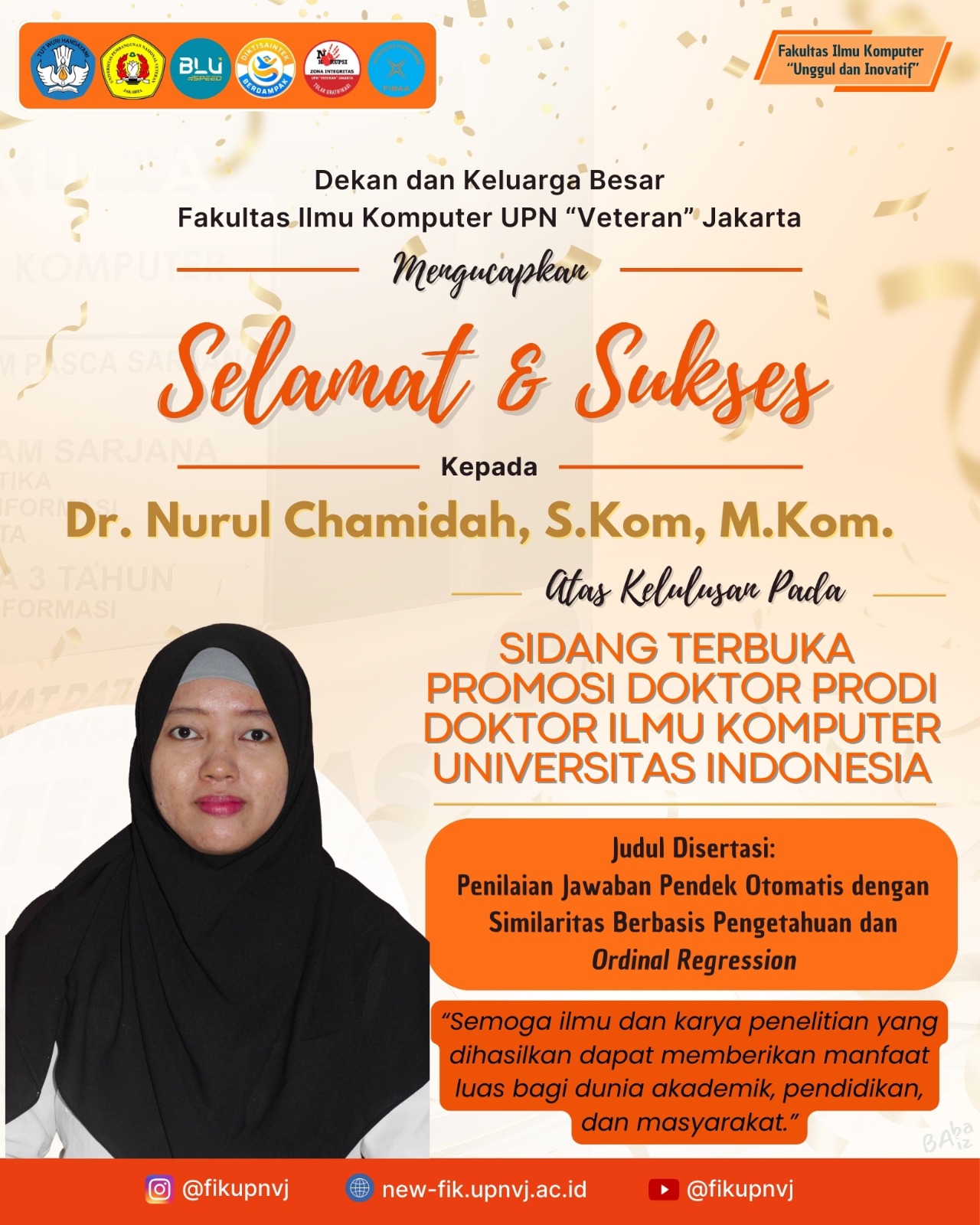 FIK UPNVJ – Seluruh Jajaran Dekanat, Dosen, Tenaga Kependidikan dan Keluarga Besar Fakultas Ilmu Komputer (FIK) Universitas Pembangunan Nasional “Veteran” Jakarta (UPNVJ) mengucapkan Selamat & Sukses kepada Dr. Nurul Chamidah, S.Kom, M.Kom atas kelulusan pada Program Doktor Ilmu Komputer Universitas Indonesia dengan judul disertasi “Penilaian Jawaban Pendek Otomatis dengan Similaritas Berbasis Pengetahuan dan Ordinal Regression”. Semoga ilmu dan karya penelitian yang dihasilkan dapat memberikan manfaat luas bagi dunia akademik, pendidikan, dan masyarakat.