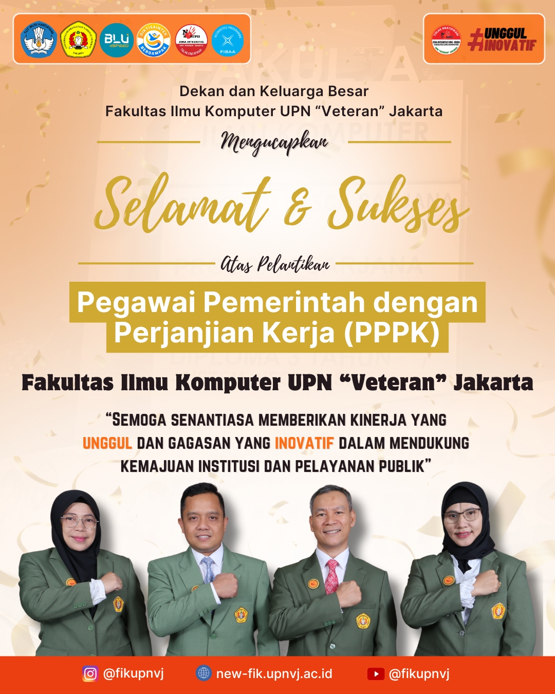FIK UPNVJ – Seluruh Jajaran Dekanat, Dosen, Tenaga Kependidikan dan Keluarga Besar Fakultas Ilmu Komputer (FIK) Universitas Pembangunan Nasional “Veteran” Jakarta (UPNVJ) mengucapkan Selamat & Sukses kepada seluruh pegawai FIK UPNVJ yang telah dilantik menjadi Pegawai Pemerintah dengan Perjanjian Kerja (PPPK). Semoga amanah dalam menjalankan tugas dan senantiasa memberikan kinerja yang unggul dan gagasan yang inovatif dalam mendukung kemajuan institusi dan pelayanan publik.