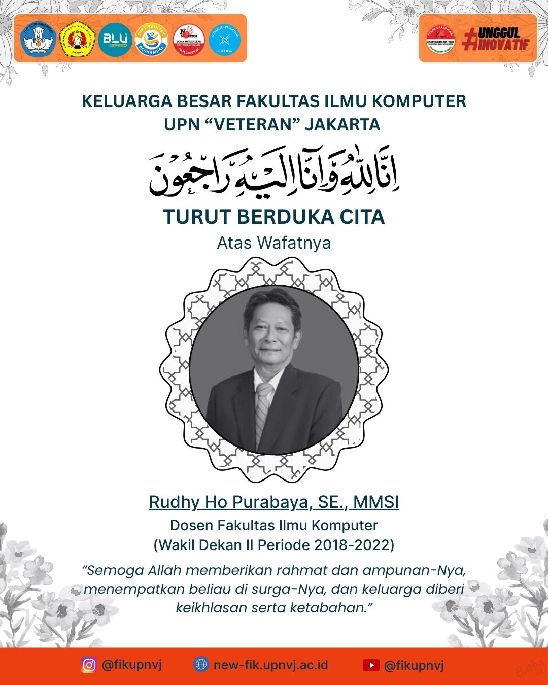 FIK UPNVJ – Seluruh Jajaran Dekanat, Dosen, Tenaga Kependidikan, dan Keluarga Besar Fakultas Ilmu Komputer (FIK) Universitas Pembangunan Nasional “Veteran” Jakarta (UPNVJ) mengucapkan Turut Berduka Cita atas wafatnya Bapak Rudhy Ho Purabaya, SE., MMSI.. Almarhum Bapak Rudhy Ho Purabaya, SE., MMSI. merupakan salah satu Dosen FIK UPNVJ. Semoga seluruh amal ibadah Beliau diterima dan seluruh kesalahan Beliau diampuni oleh Tuhan Yang Maha Esa, serta seluruh keluarga yang ditinggalkan diberikan ketabahan dan kesabaran.