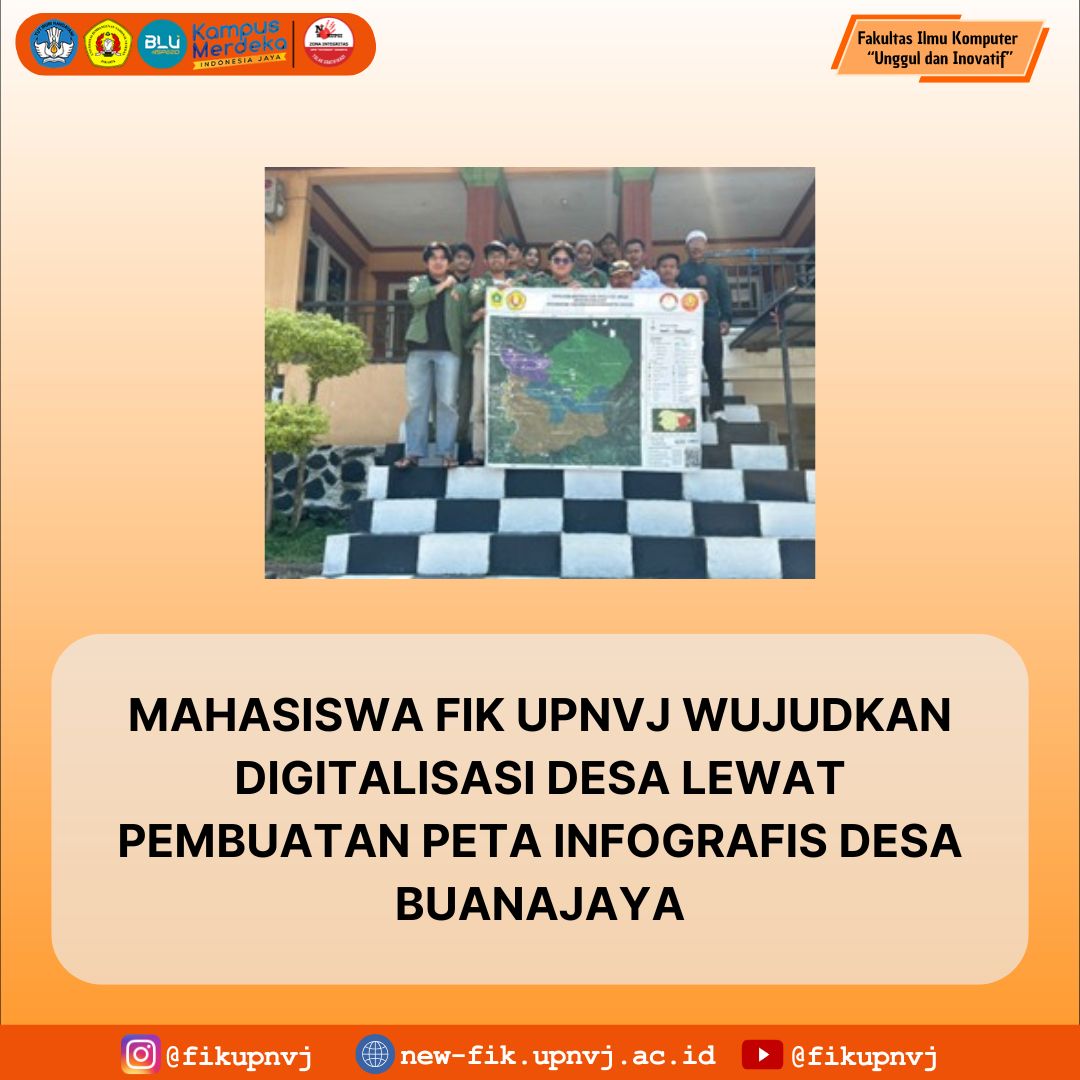 Bogor, 9 Oktober 2025 — Mahasiswa Fakultas Ilmu Komputer (FIK) Universitas Pembangunan Nasional “Veteran” Jakarta (UPNVJ) berhasil membuat dan memasang peta infografis wilayah Desa Buanajaya, Kecamatan Tanjungsari, Kabupaten Bogor. Kegiatan ini menjadi bagian dari Program Aktualisasi Bela Negara (ABN) yang berfokus pada transformasi digital di tingkat desa.