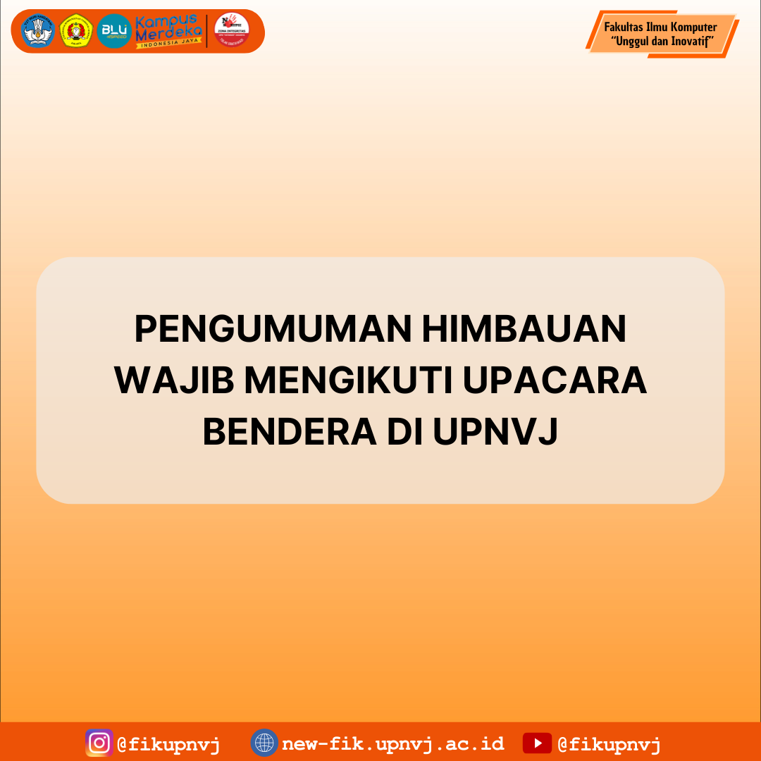 Pengumuman Himbauan Wajib Mengikuti Upacara Bendera di UPNVJ 3 October 2025 Reihan FIK 0 View Fullscreen Informasi lainnya dapat dilihat pada https://www.upnvj.ac.id/ Post Views: 11 Share Tags: FIK UPNVJKampus Bela NegaraPengumumanUPN "Veteran" JakartaUPNVJ