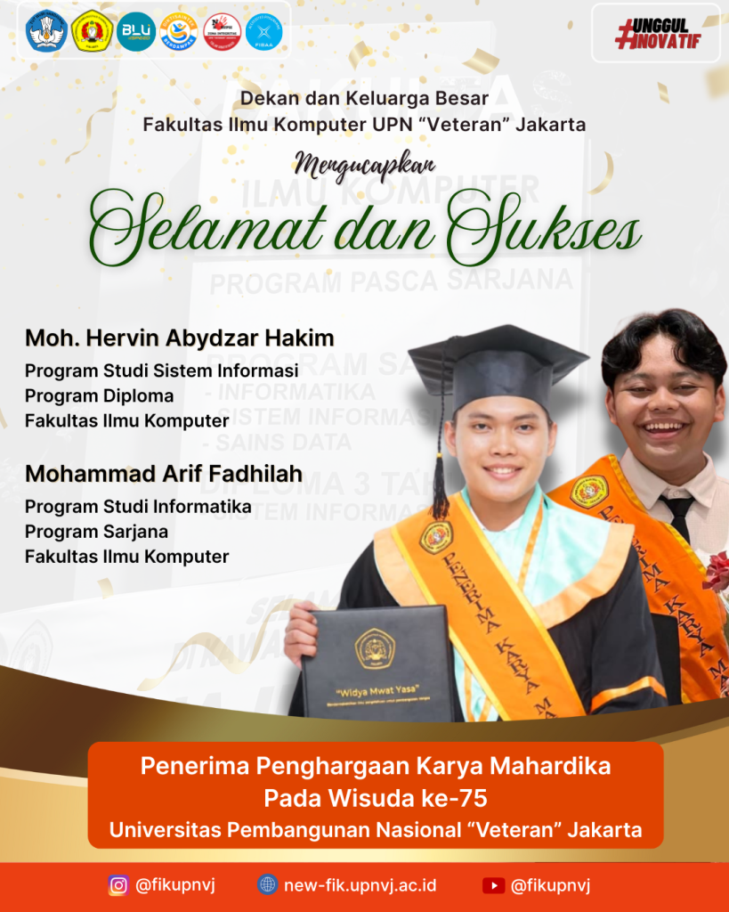 Mahasiswa FIK Juara Lomba Nasional Mahasiswa FIK menjuarai lomba Business Plan Mahasiswa Berprestasi 3 October 2025 Seminar Sekolah Legislatif Dengan Tema “Dari Suara ke Kebijakan – Cara Aspirasi Rakyat Bisa Didengar di Parlemen” diselenggarakan oleh SMF-IK UPN “Veteran” Jakarta Read More 17 September 2025 Selamat & Sukses Kepada Mahasiswa FIK yang telah Menerima Penghargaan Karya Mahardika pada Wisuda ke-75 Read More 8 August 2025 Tim DirDev Raih Juara 2 Kategori Mobile Application di FIT Competition 2025 UKSW Salatiga Read More 31 July 2025 Selamat & Sukses Kepada Tim Mahasiswa FIK yang telah lolos PKM Skema Insentif Tahun 2025 Read More 17 July 2025 Selamat & Sukses Kepada Tim Mahasiswa FIK yang telah Meraih Juara 3 pada Lomba Web Development Read More 17 July 2025 Selamat & Sukses Kepada Tim Mahasiswa FIK yang telah Meraih Best Paper pada Lomba Business Case Competition Read More 4 July 2025 Selamat & Sukses Kepada Seluruh Tim Mahasiswa FIK yang telah Lolos Pendanaan PKM Tahun 2025 Read More 18 June 2025 Selamat & Sukses Kepada Tim Mahasiswa FIK yang telah Meraih Juara 2 pada Lomba Android Programming Read More 11 June 2025 Selamat & Sukses Kepada Tim Mahasiswa FIK yang telah Meraih Top 4 pada Perlombaan Hackathon Read More 10 June 2025 Selamat & Sukses Kepada Tim Mahasiswa FIK yang telah Meraih Juara 1 pada Perlombaan Hackathon Read More