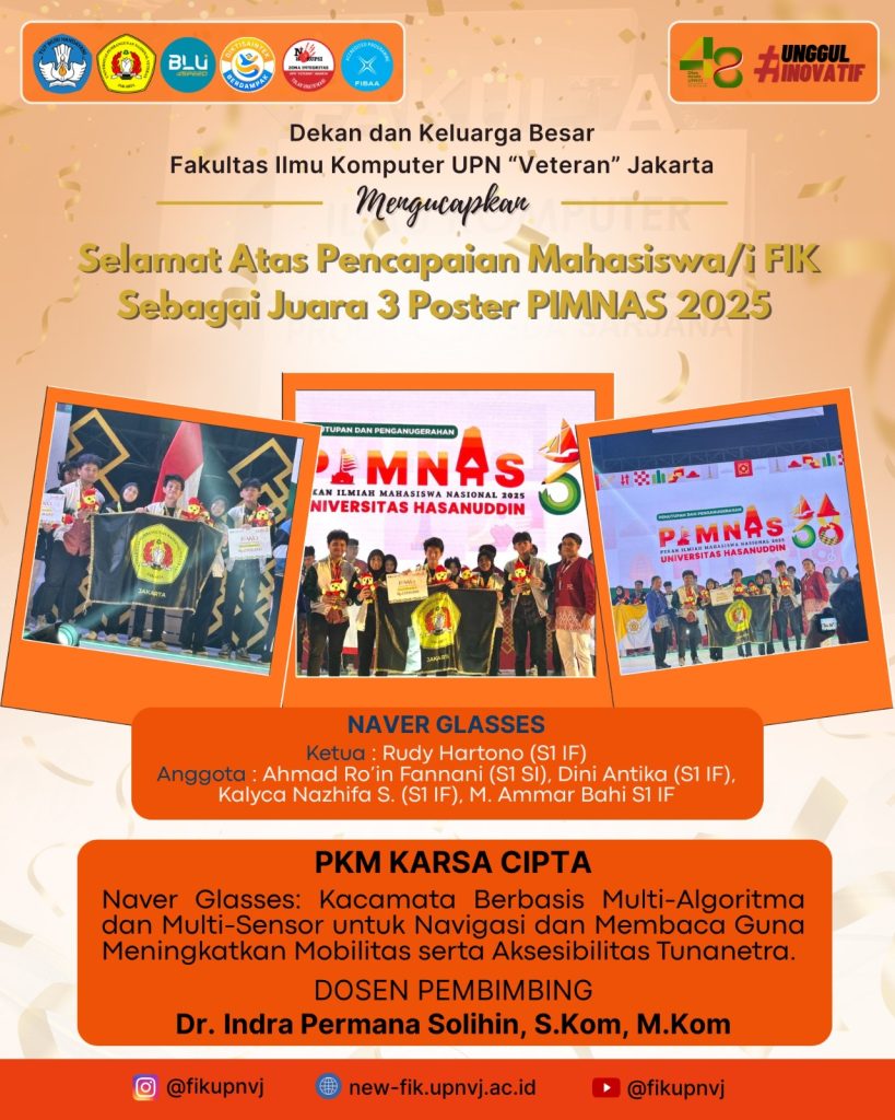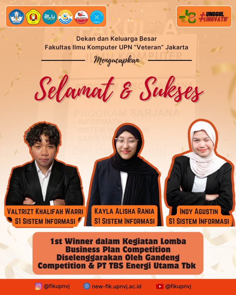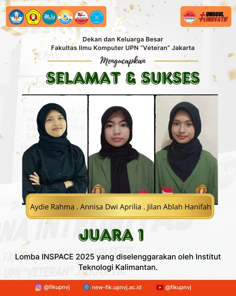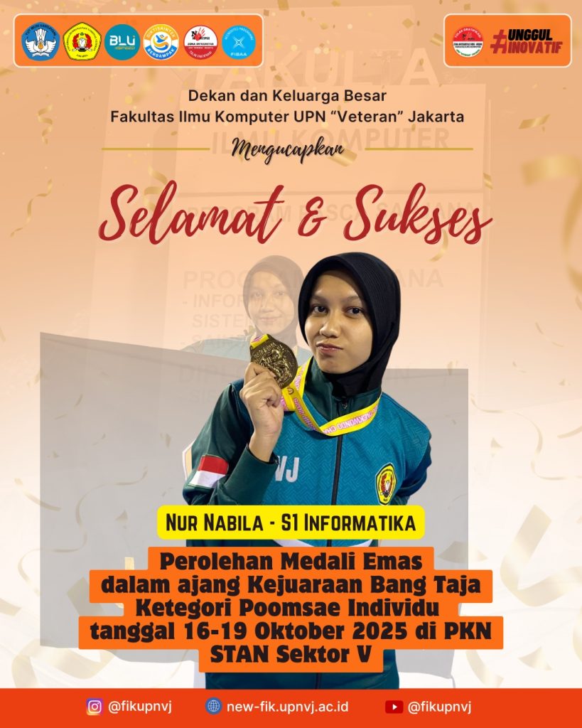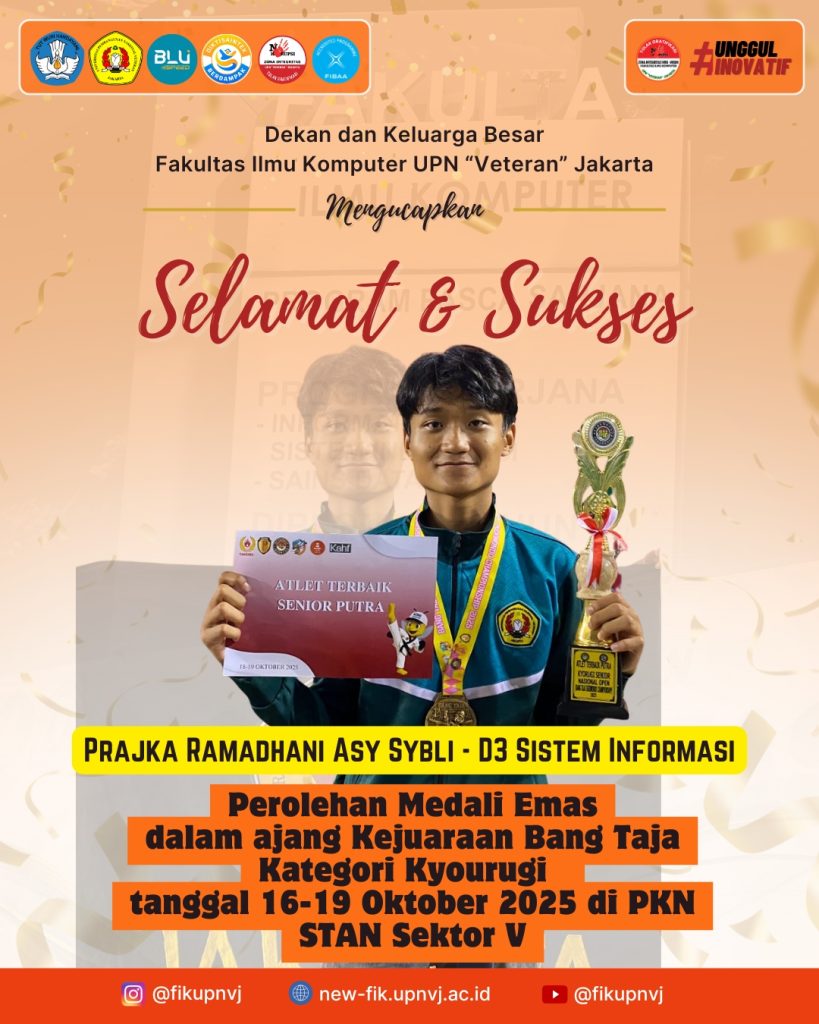 Mahasiswa FIK Juara Lomba Nasional Mahasiswa FIK menjuarai lomba Business Plan Mahasiswa Berprestasi 30 November 2025 Selamat & Sukses Kepada Tim Mahasiswa FIK yang telah Meraih Juara 3 Poster PIMNAS 2025 Kategori PKM karsa Cipta Read More 27 November 2025 Mahasiswa FIK UPNVJ Tunjukkan Kekompakan pada Lomba Senam Tabola Bale di Dies Natalis ke-48 Read More 18 November 2025 Selamat & Sukses Kepada Tim Mahasiswa FIK yang telah Meraih Juara 1 pada Business Plan Competition Read More 13 November 2025 Selamat & Sukses Kepada Tim PKM Mahasiswa FIK yang telah Lolos PIMNAS 2025 Read More 13 November 2025 Selamat & Sukses Kepada Tim PKM Mahasiswa FIK yang telah Lolos PIMNAS 2025 Read More 26 October 2025 Selamat & Sukses Kepada Mahasiswa FIK yang telah Meraih Medali Perak dalam Kejuaraan Taekwondo Kategori Kyourugi Read More 25 October 2025 Selamat & Sukses Kepada Mahasiswa FIK yang telah Meraih Medali Emas dalam Kejuaraan Taekwondo Kategori Poomsae Read More 25 October 2025 Selamat & Sukses Kepada Mahasiswa FIK yang telah Meraih Medali Emas dalam Kejuaraan Taekwondo Kategori Kyourugi Read More 24 October 2025 Selamat & Sukses Kepada Tim Mahasiswa FIK yang telah Meraih Juara 1 pada Lomba Inspace 2025 Read More 3 October 2025 Seminar Sekolah Legislatif Dengan Tema “Dari Suara ke Kebijakan – Cara Aspirasi Rakyat Bisa Didengar di Parlemen” diselenggarakan oleh SMF-IK UPN “Veteran” Jakarta Read More