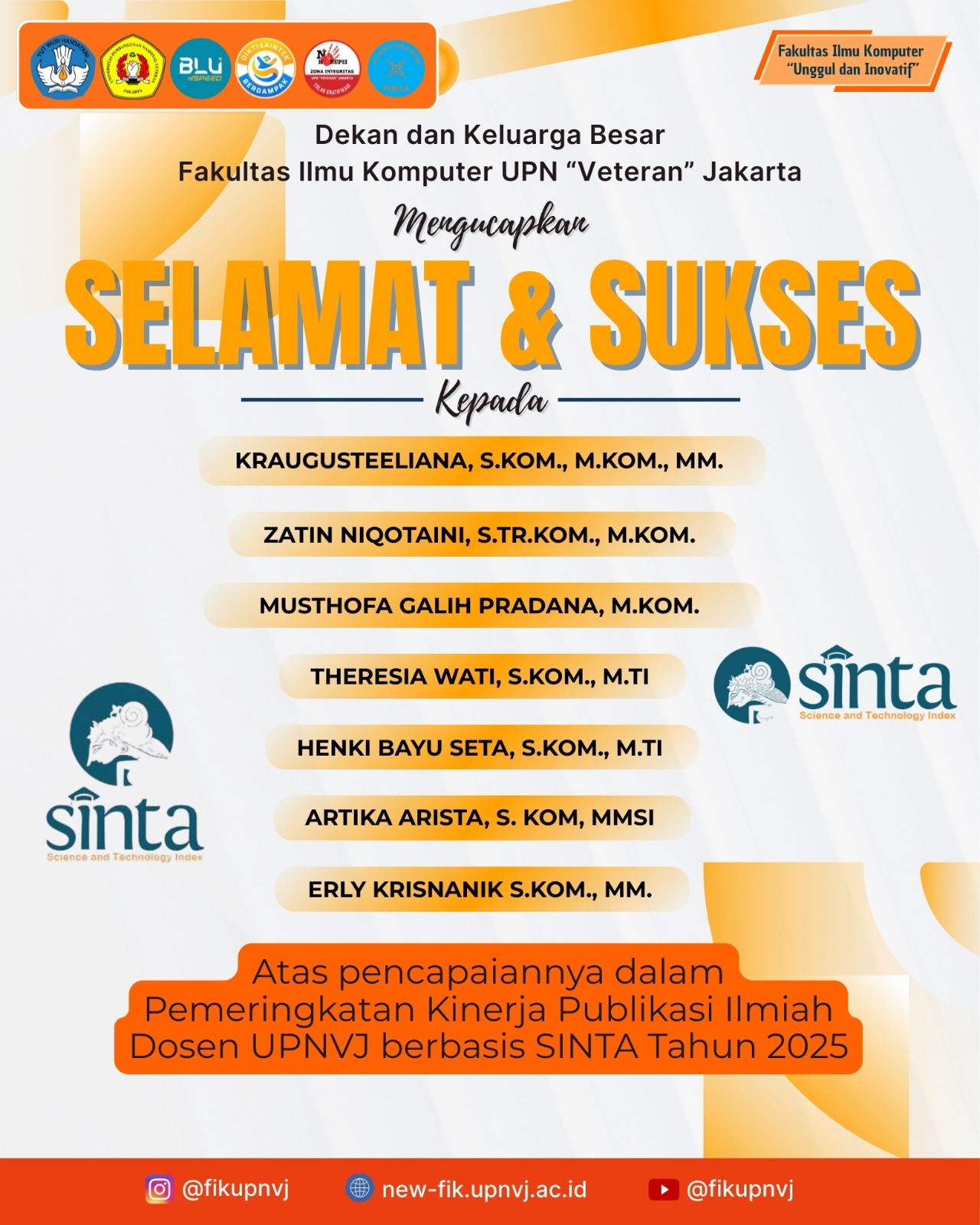 FIK UPNVJ – Beberapa dosen Fakultas Ilmu Komputer (FIK) Universitas Pembangunan Nasional “Veteran” Jakarta (UPNVJ) telah mencapai Pemeringkatan Kinerja Publikasi Ilmiah Dosen UPNVJ berbasis SINTA Tahun 2025. Keluarga Besar Fakultas Ilmu Komputer mengucapkan Selamat dan Sukses kepada Kraugusteeliana, S.Kom., M.Kom., MM., Zatin Niqotaini, S.Tr.Kom., M.Kom., Musthofa Galih Pradana, M.Kom., Theresia wati, S.Kom., M.TI, Henki Bayu Seta, S.Kom., M.TI, Artika Arista, S. Kom, MMSI, dan Erly Krisnanik S.Kom., MM. yang telah memperoleh pencapaian ini. Kabar gembira ini menjadi salah satu kebanggaan bagi Fakultas Ilmu Komputer (FIK) UPNVJ. Semoga pencapaian yang diperoleh dapat mengharumkan nama FIK UPNVJ dan memberikan kontribusi yang besar pada kehidupan berbangsa dan bernegara.