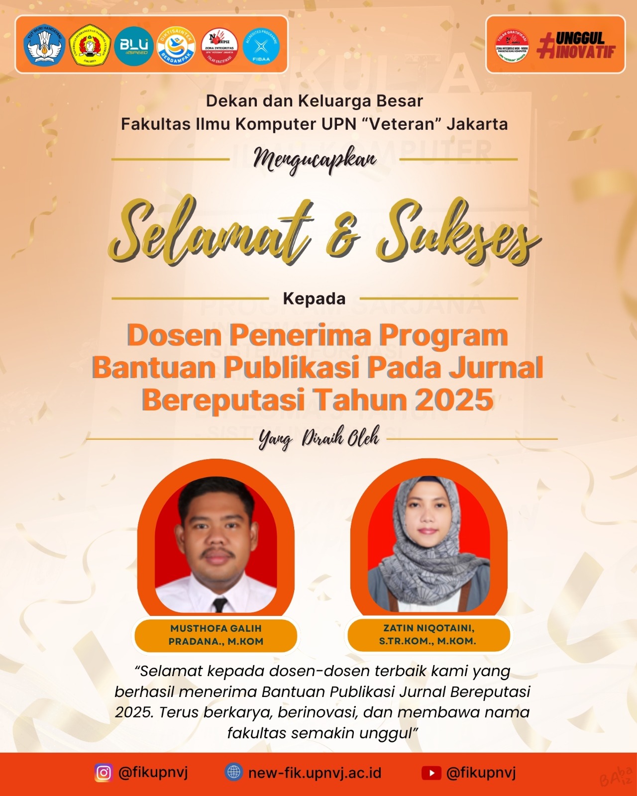 FIK UPNVJ – Dosen Fakultas Ilmu Komputer (FIK) Universitas Pembangunan Nasional “Veteran” Jakarta (UPNVJ) memperoleh Program Bantuan Publikasi pada Jurnal Bereputasi Tahun 2025. Keluarga Besar Fakultas Ilmu Komputer mengucapkan Selamat dan Sukses kepada Musthofa Galih Pradana, M.Kom. dan Zatin Niqotaini, S.Tr.Kom., M.Kom. yang telah berhasil menerima program ini. Kabar gembira ini menjadi salah satu kebanggaan bagi Fakultas Ilmu Komputer (FIK) UPNVJ. Semoga program yang diperoleh ini dapat mengharumkan nama FIK UPNVJ dan memberikan kontribusi yang besar pada kehidupan berbangsa dan bernegara.