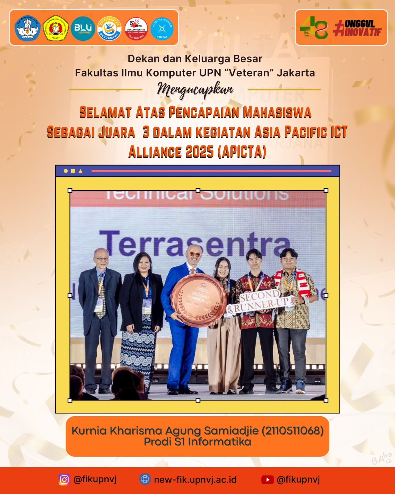 FIK UPNVJ – Mahasiswa Fakultas Ilmu Komputer (FIK) Universitas Pembangunan Nasional “Veteran” Jakarta (UPNVJ) Meraih Juara 3 pada Kegiatan Asia Pacific ICT Allicance 2025. Keluarga Besar Fakultas Ilmu Komputer mengucapkan Selamat dan Sukses kepada Kurnia Kharisma Agung Samiadjie yang telah berjuang dan meraih Juara 3. Kabar gembira ini menjadi salah satu kebanggaan bagi Fakultas Ilmu Komputer (FIK) UPNVJ. Semoga berita ini menjadi inspirasi bagi mahasiswa Fakultas Ilmu Komputer lainnya untuk selalu optimis dan semangat dalam menggapai cita-cita.