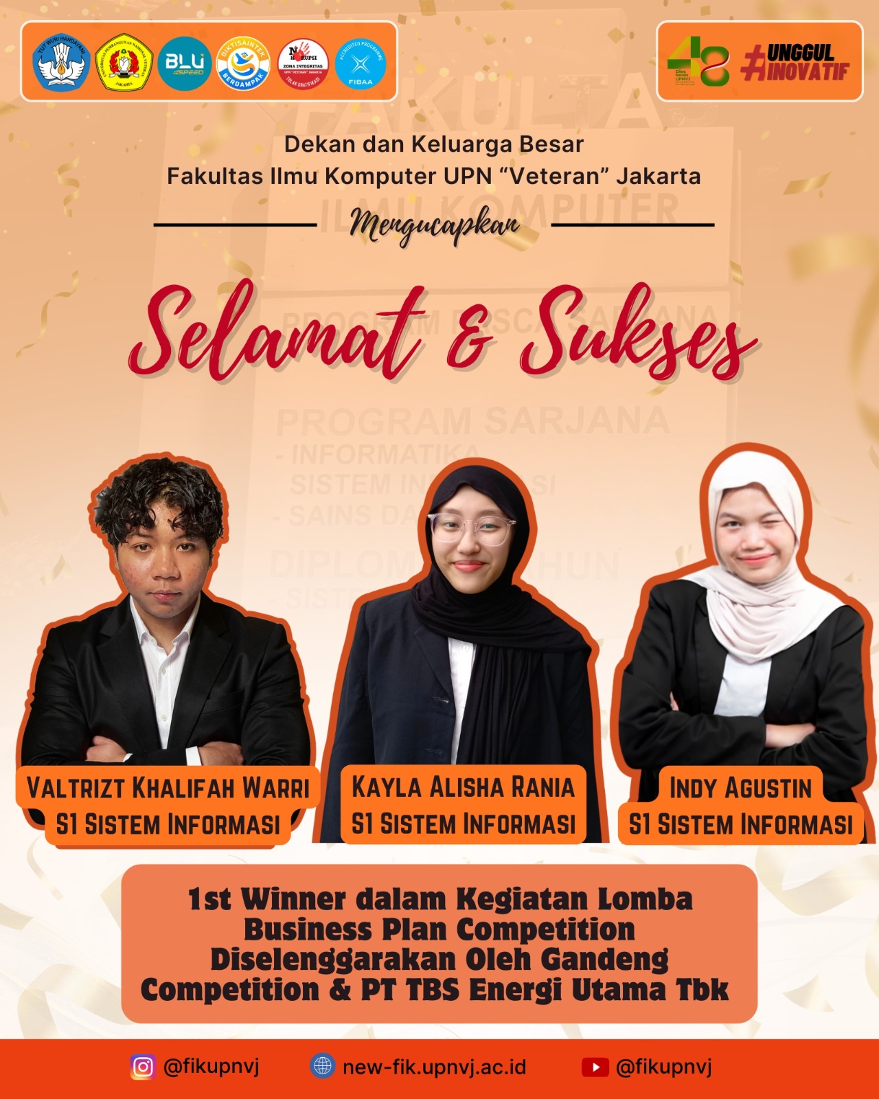 FIK UPNVJ – Mahasiswa Fakultas Ilmu Komputer (FIK) Universitas Pembangunan Nasional “Veteran” Jakarta (UPNVJ) Meraih Juara 1 pada Business Plan Competition yang diselenggarakan oleh Gandeng Competition & PT TBS Energi Utama Tbk. Keluarga Besar Fakultas Ilmu Komputer mengucapkan Selamat dan Sukses kepada Kayla Alisha Rania, Indy Agustin, dan Valtrizt Khalifah Warri yang telah berjuang dan meraih Juara 1 pada Business Plan Competition. Kabar gembira ini menjadi salah satu kebanggaan bagi Fakultas Ilmu Komputer (FIK) UPNVJ. Semoga berita ini menjadi inspirasi bagi mahasiswa Fakultas Ilmu Komputer lainnya untuk selalu optimis dan semangat dalam menggapai cita-cita.