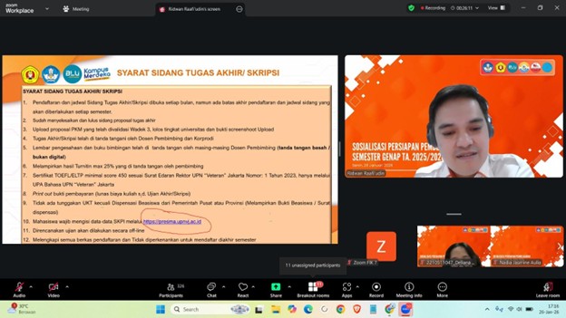 FIK UPNVJ – Program Studi Informatika Fakultas Ilmu Komputer (FIK) UPN “Vteran” Jakarta (UPNVJ) menyelenggarakan kegiatan Sosialisasi Persiapan Pembelajaran Semester Genap Tahun Akademik 2025/2026 pada 26 Januari 2026. Kegiatan ini bertujuan untuk memberikan pemahaman kepada dosen dan civitas akademika mengenai berbagai kebijakan, jadwal akademik, serta strategi pembelajaran yang akan diterapkan pada semester genap.