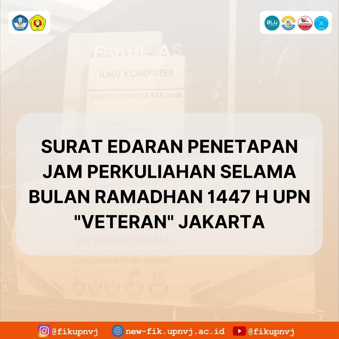 Surat Edaran Penetapan Jam Perkuliahan Selama Bulan Ramadhan 1447 H UPN “Veteran” Jakarta 16 February 2026 Reihan FIK 0 View Fullscreen Informasi lainnya dapat dilihat pada web UPNVJ. Post Views: 4 Share Tags: FIK UPNVJInformasiKampus Bela NegaraUPN "Veteran" JakartaUPNVJ