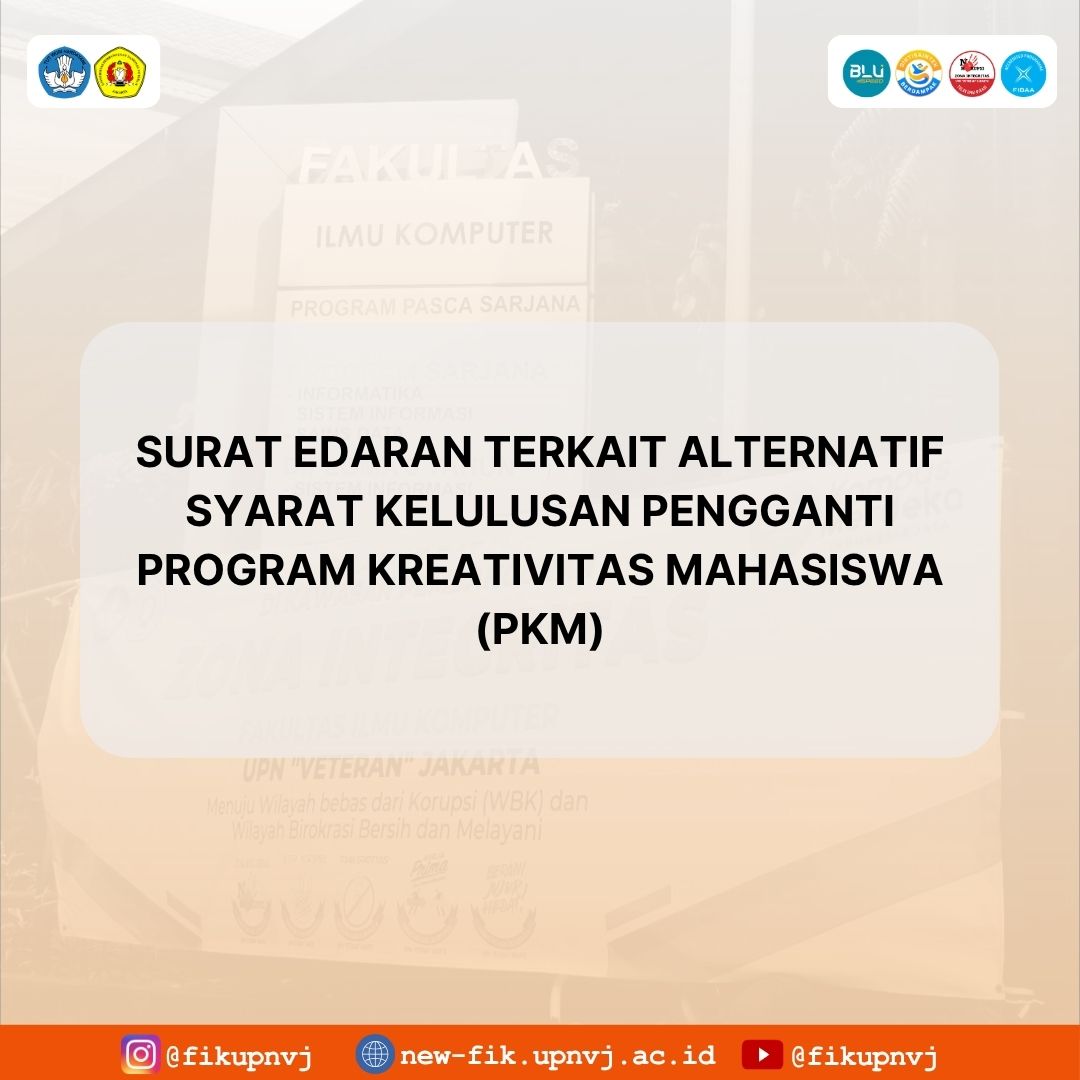 Surat Edaran terkait Alternatif Syarat Kelulusan Pengganti Program Kreativitas Mahasiswa (PKM) 20 April 2026 Reihan FIK 0 View Fullscreen Informasi lainnya dapat dilihat pada web UPNVJ Post Views: 6 Share Tags: FIK UPNVJKampus Bela NegaraUnggul & InovatifUPN "Veteran" JakartaUPNVJ