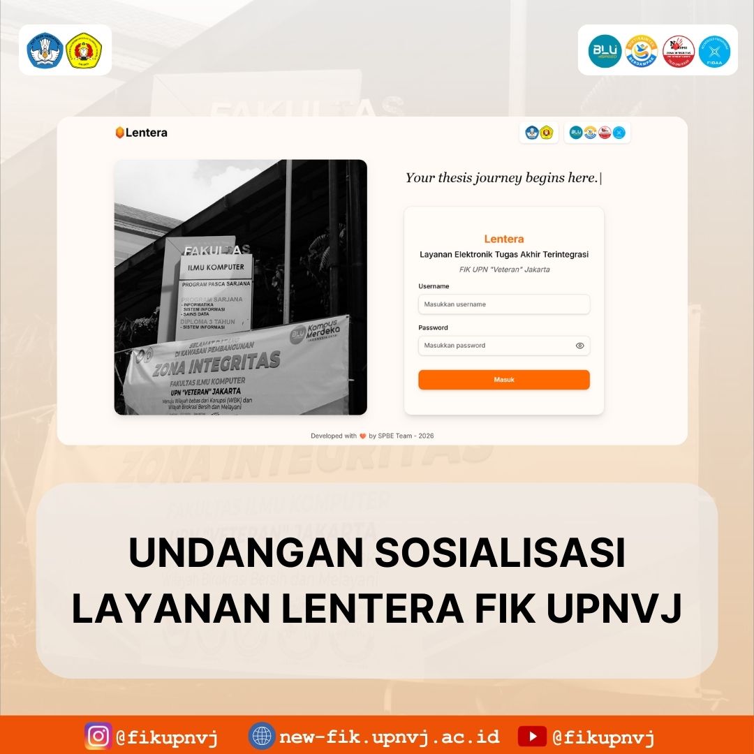 Undangan Sosialisasi Web LENTERA Bagi Mahasiswa Tingkat Akhir FIK UPNVJ 10 February 2026 Reihan FIK 0 View Fullscreen Post Views: 21 Share Tags: FIK UPNVJKampus Bela NegaraPengumumanUPN "Veteran" JakartaUPNVJ
